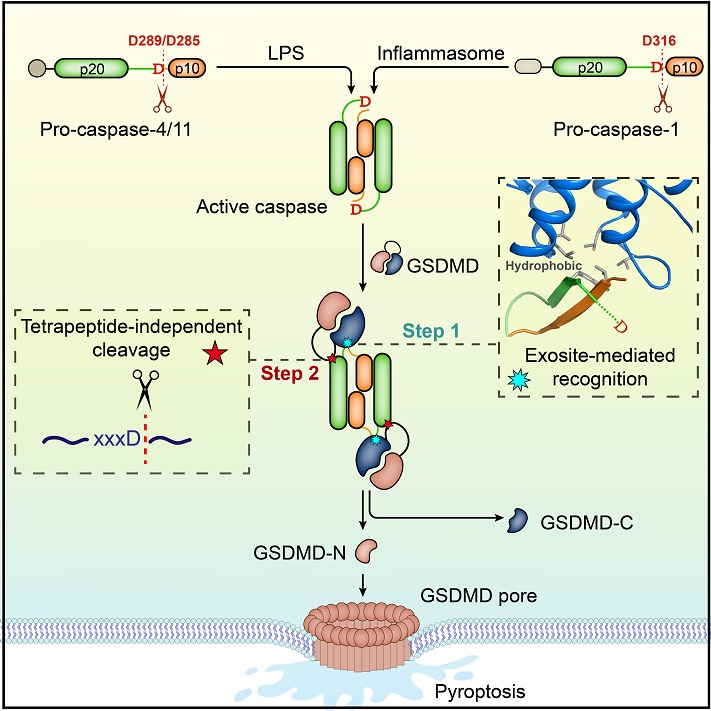 The dogma in caspase biochemistry is that all caspases recognize a tetrapeptide motif xxxD (D for aspartate, x for any residue) within a substrate and cleave after the aspartate. Extensive peptide substrate profiling has established the tetrapeptide sequence preferred by each caspase. Caspases in apoptosis often cleave a dozen of substrates. However, caspase-4/11 only have one known physiological substrate GSDMD, and caspase-1 cleave two more cytokines IL-1β/18 besides GSDMD. The caspase dogma cannot explain why caspases in innate immunity bear such a narrow substrate spectrum. Surprisingly, researchers found that mutation of the cleavage-site tetrapeptide in GSDMD did not affect caspase cleavage and pyroptosis induction. Further mapping by domain truncation and building chimeric proteins revealed that the GSDMD-C domain, but not the cleavage-site tetrapeptide mediates recognition of GSDMD by activated caspase-4/11. Researchers successfully determined the crystal structures of the complexes between autoprocessed caspase-4/11 and GSDMD-C domain. The complex structures show that autoprocessed caspase-4/11 p20/p10 further dimerize to form a heterotetramer. At the dimerization interface, the C-terminal loop of p20 in a p20/p10 bundles with the N-terminal loop of p10 in the other p20/p10, forming a two-strand intermolecular β-sheet which extends outwards, distantly from the catalytic site cysteine. The intermolecular β-sheet shapes like a key inserted into a preformed hydrophobic groove in the GSDMD-C domain.Eachcaspase-4/11 heterotetramer contains two symmetric intermolecular β-sheets which mediate binding of two GSDMD-C molecules, resulting in a 2:2 enzyme-substrate complex. The caspase-4/11-GSDMD complex structures also demonstrate that N-terminal extension of p10 would introduce inappropriate structural clashes to GSDMD-C domain, explaining why caspase-4/11 need to be precisely processed at Asp289/285. Mutagenesis analyses confirmed the hydrophobic interface is the structural basis for caspase-GSDMD recognition and GSDMD-cleavage-mediated pyroptosis. Researchers further investigated the caspase-1 recognition of GSDMD. Crystal structure of caspase-1-GSDMD-C complex shows a similar GSDMD-recognition mode ascaspase-4/11, which is mediated by the hydrophobic interface and independently of the cleavage-site tetrapeptide.
