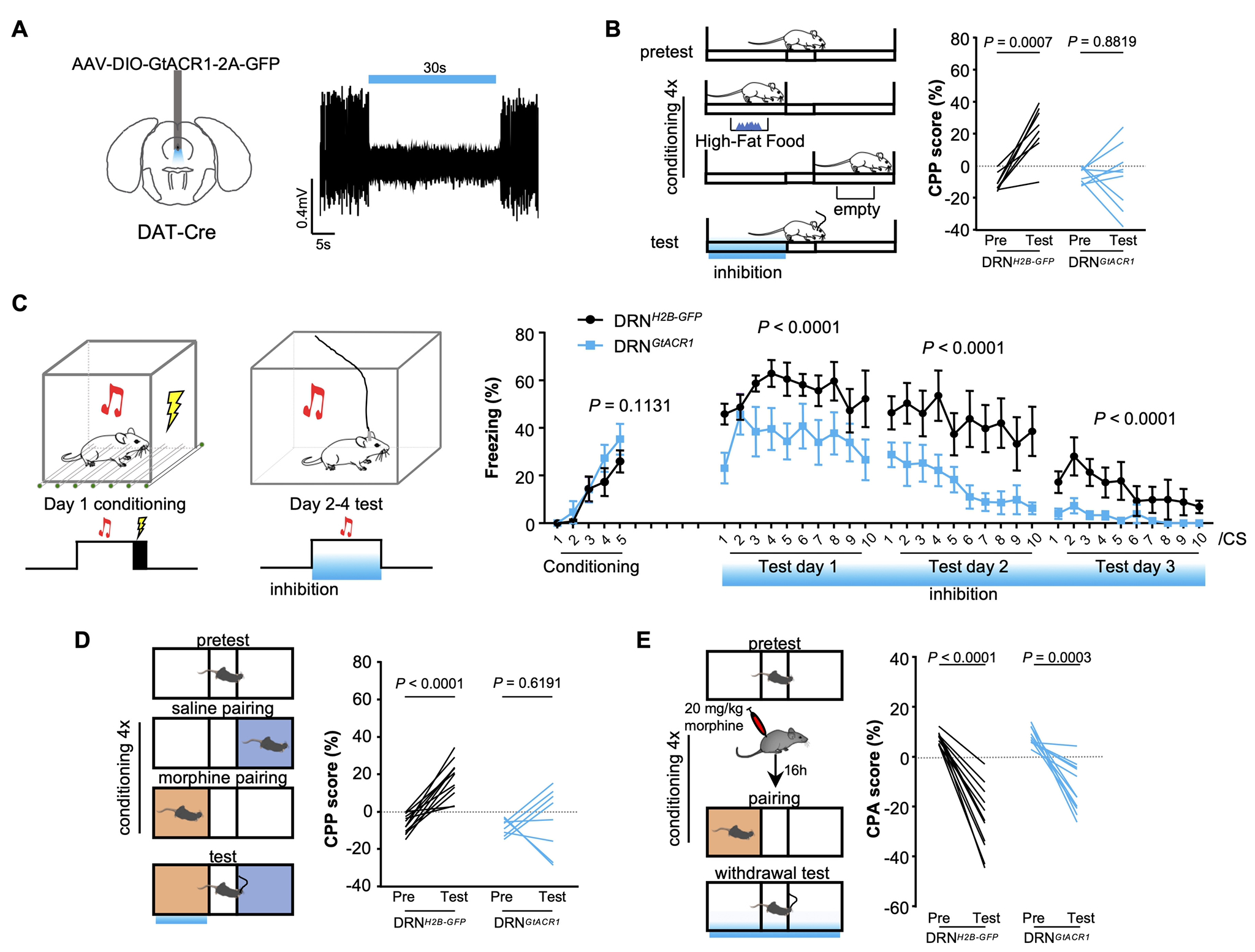 The authors then asked whether and how DRN DA neurons participate in the formation and/or expression of incentive memory. Using cell-type specific genetic ablation or optogenetic inhibition, they found that DRN DA neurons specifically control the expression of natural reward and fear memory. These neurons are also essential for the expression of opioid drug memory. DRN DA neurons show elevated activities during opioid memory recall. Ablating or inhibiting these neurons block the expression of drug memories associated with opioid intake or withdrawal.