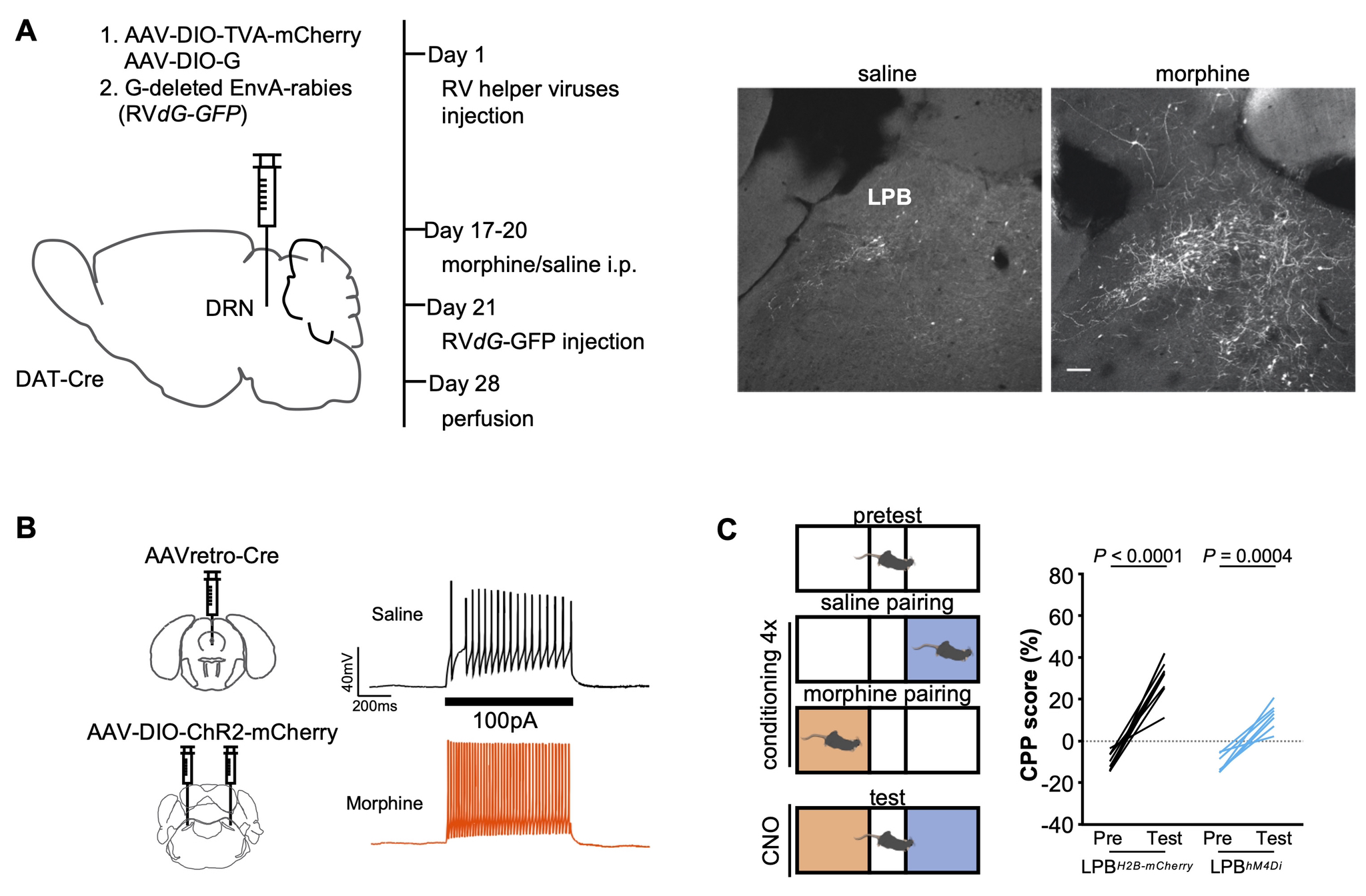 Using morphine as the probe to search for functionally relevant inputs to DRN DA neurons, the authors further identified a glutamatergic pathway from the lateral parabrachial nucleus (LPB) to the DRN that specifically regulates reward processing. Morphine administration causes an increase of glutamatergic inputs from the LPB to DRN DA neurons, and this increase is mediated by the morphine-induced enhancement of DRN-projecting LPB neurons’ excitability. Silencing or blocking the neurotransmission of DRN-projecting LPB neurons impairs the expression of reward memory and the reward processing of DRN DA neurons.