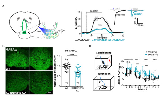 Figure 1. Triple KO of KCTD8/12/16 reduces the GABABreceptors-mediated potentiation of synaptic glutamate release, expression of GABAB2in the axonal terminals of MHb neurons, and displays enhanced Ca2+signal responses to aversion-predicting cues.