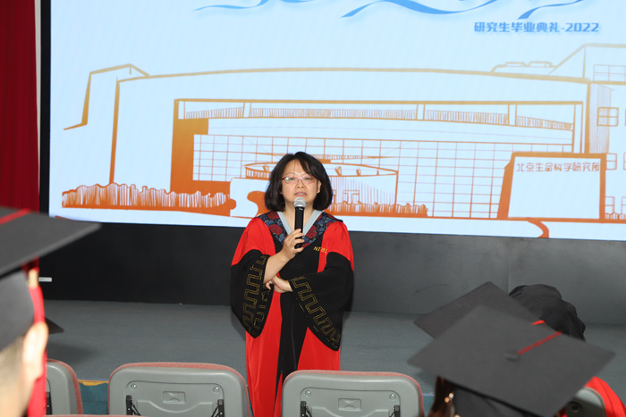 毕业生代表史旭歘同学在典礼上发言。她代表同学们,表达了对研究所老师们、同学们及全所工作人员们的感激之情,阐述了自己在TIMBR/NIBS几年学习科研中获得的经验和收获。同时祝TIMBR/NIBS和全体毕业生同学越来越好!