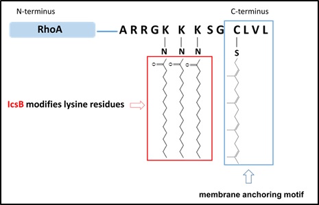 在这项研究中,邵峰实验室的研究人员首先发现在酵母细胞或哺乳动物细胞中异位表达IcsB,会产生很强的细胞毒性,抑制细胞生长,并且,表达IcsB的细胞会有明显的形态变化:从舒展的贴壁状态变成漂浮的圆球状。这种形态变化暗示IcsB可能是直接或间接破坏了宿主的细胞骨架结构。 进一步的研究发现,IcsB可以严重破坏细胞骨架中的肌动蛋白纤维(filamentous actin fibers),同时上游控制肌动蛋白纤维组装的Rho家族小G蛋白由于IcsB的存在也失去了活性。研究人员然后通过一系列严谨的生化和细胞实验,最终发现IcsB是一个全新的长链(18-C)脂肪酰基转移酶,通过这个特殊的酶学活性使得Rho家族小G蛋白C端的富含碱性氨基酸(PBR)区域中的赖氨酸侧链氨基上被加上一条长长的“脂肪链尾巴”,这种修饰导致小G蛋白失活,丧失了调控肌动蛋白纤维组装的能力,使得IcsB对酵母和哺乳动物细胞显示出细胞毒性。