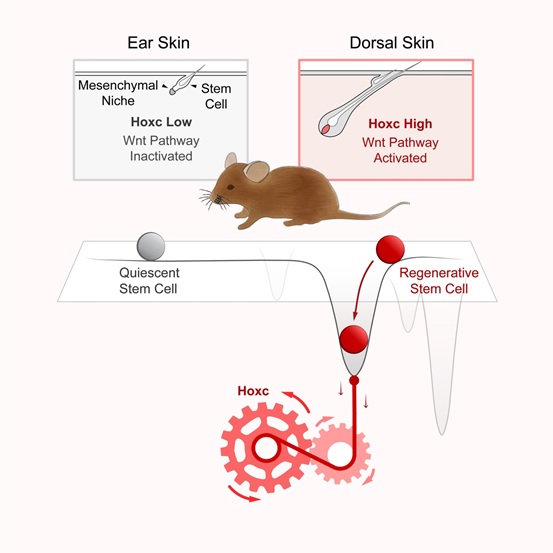 2018年8月16日,陈婷实验室在《Cell Stem Cell》杂志在线发表了题为“Hoxc-dependent mesenchymal niche heterogeneity drives regional hair follicle regeneration”的研究论文。该论文发现在小鼠身体不同部位的皮肤中,Hoxc在干细胞微环境中的差异性表达引起下游Wnt信号通路的激活的差别,从而引起毛囊干细胞再生的位置性差异,揭示了干细胞微环境在身体水平的异质性与可塑性如何影响干细胞再生能力的分子机制。
