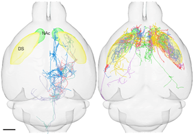 研究人员利用不同血清型的AAV病毒,进一步拓展了稀疏标记系统,实现了投射特异性的神经元稀疏标记。利用此方法并结合fMOST成像,研究人员成功对皮层-纹状体投射神经元进行特异性标记和完整重构(图三)。