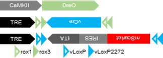 这两个病毒需混合后进行脑内注射。混合病毒侵染神经元后,若神经元内无Cre表达,则标记不发生。当病毒感染Cre阳性神经元后,控制子中的Cre依赖的转录元件会被翻转。由于此时神经元内没有tTA表达,TRE启动子转录活性低。在大多数被病毒侵染的Cre阳性神经元中FLPo表达量极低,无法触发放大子中FLP依赖的转录模块的翻转。随机的,在某些Cre阳性神经元中,FLPo表达量达到一定的水平,触发放大子中FLP依赖的转录模块的翻转。由于放大子同样使用TRE启动子,转录活性低,只有少量的GFP和tTA表达。此时,在极少量细胞内tTA的表达量达到一定水平,足以结合TRE启动子并启动其后基因的转录,正反馈回路被触发:细胞表达更多的FLPo对剩余的放大子组件进行翻转,并使更多的GFP和tTA被表达出来,标记强度得到增强(图1右)。