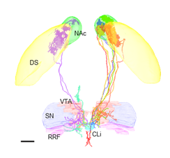 基于这一标记系统,罗敏敏课题组与华中科技大学国家光电研究中心fMOST课题组合作,建立了“稀疏标记-样本包埋-fMOST成像-神经元重构-数据校准-量化分析”的流水线,实现了稳定高通量的全脑成像和图像分析。借助这一流水线,研究人员在DAT-Cre小鼠中重构了15个中脑多巴胺神经元的完整形态。通过单细胞形态学分析,研究人员能够将重构的多巴胺神经元分为两类:一类多巴胺神经元只有单个投射目标,轴突在终点处会形成密集的末端树状分支(图二左);另一类投射轴突分布比较广泛,会有多个旁分支投向不同目标,少有末端树状分支(图二右)。