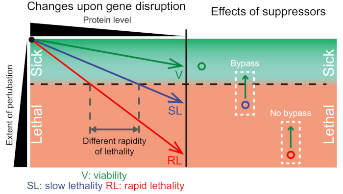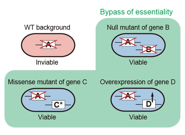 文献中零星地报道过一种现象,敲除一个必需基因所造成的致死表型能被另一基因的突变或者过表达挽救,也就是说,一个基因的必需性可以因另一基因的遗传改变而丢失。这是一种特殊的基因间的遗传相互作用,但尚未被系统深入地分析过,也还没有名字。杜立林实验室将这种遗传相互作用命名为必需性省却(bypass of essentiality),英文缩写为BOE;将能导致必需性丢失的突变或者过表达称作必需性省却抑制子(BOE suppressor);并将可通过这种方式丢失必需性的基因称作可省却必需基因(bypassable essential genes)(图一)。