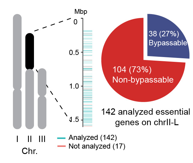 在“Systematic analysis reveals the prevalence and principles of bypassable gene essentiality”一文中,杜立林实验室利用化学诱变、转座子诱变、以及过表达质粒文库这三种不同的遗传操作手段,系统地对单细胞真核模式生物粟酒裂殖酵母Schizosaccharomyces pombe二号染色体左臂上的必需基因开展了必需性省却抑制子的筛选,最终发现在被分析的142个必需基因中,高达27%是可省却必需基因(图二)。这一发现提示,基因必需性省却不是一种罕见现象,而是有相当高的普遍性。