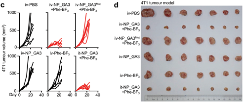 抗体偶联药物多用来做为小分子药物的载体,而金纳米颗粒 (Nanoparticle, NP) 被广泛的应用在活体运送蛋白中。通过合成具有三乙基硅基(TES)“启动子”的连接链,将荧光蛋白固定在纳米金颗粒上,构建了蛋白质前药 (NP-GFP)。细胞通过内吞作用将NP-GFP导入胞质中,而后加入Phe-BF3将蛋白和金纳米中间的连接切段,实现了细胞水平荧光蛋白的可控释放。利用EPR效应,蛋白质前药可以在肿瘤特异性富集。将NP-NP以及Phe-BF3顺次通过尾静脉注射入小鼠体内后,和ADC系
