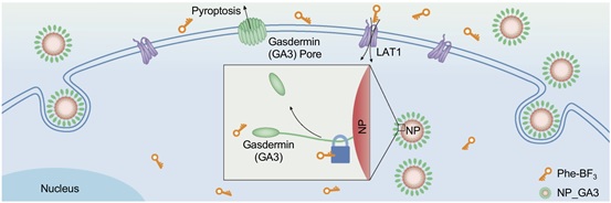 在成功实现活性蛋白分子肿瘤原位可控释放的基础上,研究人员进一步开展了利用该生物正交方法在肿瘤内释放和激活Gasdermin蛋白的研究。基于上述金纳米颗粒及连接链,研究人员设计合成了连接Gasdermin的蛋白前药—NP-GSDMA3和NP-GSDMA3(mut) (E14K/L184D, 细胞膜打孔活性丧失突变体)。在细胞水平对该细胞焦亡诱导体系验证表明,当Phe-BF3进入细胞后,可在胞内将GSDMA3蛋白从金纳米颗粒上释放出来从而引发明显的细胞焦亡;而没有打孔活性NP-GSDMA3(mut)在Phe-BF3作用下则完全不能够引起细胞焦亡。
