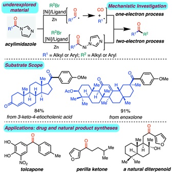 酮在有机合成化学中占有重要的位置。早期,科学家通过有机金属试剂与羧酸衍生物发生亲核取代反应来制备酮,但由于有机金属试剂制备复杂且常具有强碱性,这限制了这种传统方法的应用范围。近年来,过渡金属催化的羰基衍生物与芳基卤代物之间的还原偶联反应由于其相对温和的反应条件,逐渐成为研究的热点。李超实验室开发的新方法不仅原料来源广泛,制备简单,而且底物适用范围非常广泛:源自于一级,二级羧酸,芳基羧酸以及位阻大的三级羧酸的酰基咪唑都能应用到反应中且能达到中等到好的收率;富电子,缺电子的苯基溴代物,以及在药物分子中常见的呋喃,苯并呋喃,吲哚,吡啶,嘧啶等芳香杂环溴代物,一级,二级烷基溴代物均适用该反应体系。同时这个反应在一定程度上兼容酯基,羰基,醚,硅醚,以及氨基甲酸酯等官能团。另外研究者还成功地将这种方法应用到一系列复杂天然产物分子和药物分子的改造和合成中,例如对一些复杂甾体类化合物的改造,对抗Parkinson药物分子Tolcapone的合成,以及对复杂呋喃二萜类天然产物的合成等等。