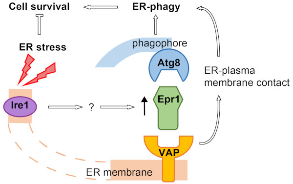 作者还发现,VAP蛋白在内质网自噬中的作用不仅是与Epr1一起建立Atg8与内质网膜的联系,而且还通过维持内质网与细胞质膜的接触促进内质网自噬。另外,作者发现,未折叠蛋白反应(unfolded protein response,UPR)信号通路的关键因子Ire1通过上调Epr1的蛋白水平促进内质网自噬。