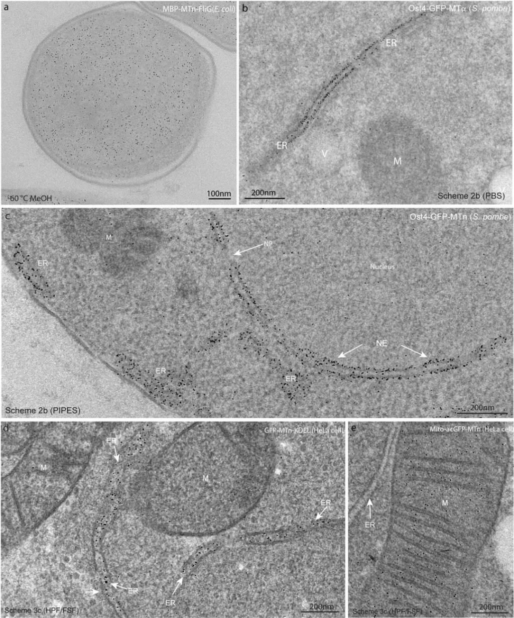 哺乳动物细胞氧化环境下(如ER内腔和线粒体基质)的标记蛋白为折叠状态,酵母的实验方案基本适用。但是哺乳动物细胞中还原环境(如细胞质中)的标记蛋白为未折叠状态,该实验方案标记效率极低且重复率低,经过不断探索,何万中研究组终于研发出了普适性更高更强健的新方案:冷冻替代固定条件下只用鞣酸(tannic acid)与醋酸铀联合低温脱水固定,避免使用巯基氧化剂和醛固定剂,实现保证细胞超微结构下高效合成纳米金颗粒,且不再受标记蛋白折叠状态限制。在HeLa细胞中对ER内腔(图2d),线粒体基质(图2e)及ER膜(朝向细胞质还原环境,图1d-f)三种定位模式的测试,表明:该金颗粒合成方案已经高度成熟有效,重复率极高,可以广泛推广使用。