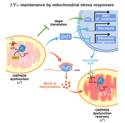 领域内过去的研究表明呼吸链缺失的线粒体通过水解ATP(来自糖酵解)来维持膜电位。该机制从酵母到哺乳动物细胞都高度保守。线粒体呼吸链缺失同时激活细胞应激反应(mitochondrial stress response),但应激反应是否参与膜电位维持并不清楚。蒋辉实验室构建了缺失呼吸链复合物Ⅲ、Ⅳ、Ⅴ和线粒体DNA(0)的酵母株系,发现这些氧化磷酸化突变体的线粒体膜电位逐渐降低(WT>缺失复合物Ⅲ/Ⅳ>缺失复合物Ⅴ>0)。研究人员对这些突变体的转录组和线粒体蛋白质组进行了全面分析,发现伴随着线粒体膜电位的逐渐降低,细胞会启动越来越多的适应性反应:(1)所有突变体都下调转录因子Hap4的翻译效率,进而下调Hap4下游基因Inh1(线粒体ATP合酶抑制蛋白),从而释放线粒体水解ATP的能力;(2)在线粒体膜电位严重下降的缺失复合物Ⅴ和0突变体中,细胞激活AMPK/Snf1,从而上调糖酵解基因,同时抑制细胞质核糖体生成。该变化加强细胞内ATP供应,同时减少ATP消耗,从而增强了线粒体的ATP供应;(3)同样在缺失复合物Ⅴ和P0突变体中,细胞高磷酸化mRNA结合蛋白Puf3,上调其结合的数百条编码线粒体蛋白的mRNA,从而促进线粒体生成(biogenesis)。在Puf3的数以百计的底物中,线粒体膜间隙蛋白转运受体Mia40的上调最为关键。抑制这些反应,例如阻断Inh1下调,0突变体无法维持膜电位和铁硫簇的合成,导致细胞生长停滞和死亡。综合而言,细胞在氧化磷酸化缺失情况下启动线粒体内外的适应性反应,以维持线粒体膜电位、铁硫簇的合成和细胞的存活与增值。