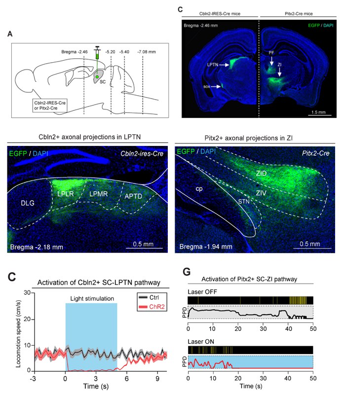 研究者通过对上丘Op层的Cbln2+细胞和InG层的Pitx2+的投射进行追踪,发现这两类细胞有着截然不同的投射脑区。通过在这两类细胞中表达ChR2,研究者发现光激活上丘Op层的Cbln2+细胞在LPTN的投射可以触发小鼠出现类似于躲避天敌的僵直(freezing)行为,而光激活上丘InG层的Pitx2+细胞在ZI的投射则可以促进小鼠的捕食猎物行为。