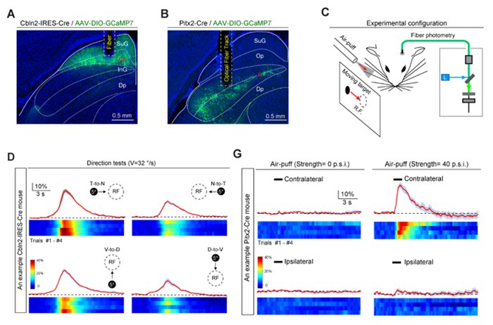 通过在Cbln2-IRES-Cre小鼠上丘Op层和Pitx2-Cre小鼠上丘InG层注射AAV-DIO-GCaMP7病毒并进行光纤记录,研究者发现上丘Cbln2+细胞对视觉刺激有较强反应,而对胡须触觉刺激无显著反应。上丘Pitx2+细胞对胡须触觉刺激有较强反应,而对视觉刺激无显著反应。