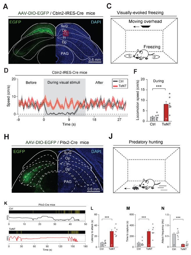 研究者随后构建了特异标记Cbln2+神经元的Cbln2-IRES-Cre小鼠,并采用了能够特异标记Pitx2+神经元的Pitx2-Cre小鼠。分别通过在这两种Cre品系的上丘注射AAV-DIO-EGFP-2A-TeNT病毒特异性阻断上丘Cbln2+细胞和Pitx2+细胞的突触传递,研究者发现上丘Op层的Cbln2+细胞是小鼠启动依赖于视觉的躲避天敌本能防御行为所必须的,而上丘InG层的Pitx2+是依赖于触觉的捕捉猎物本能行为所必须的。