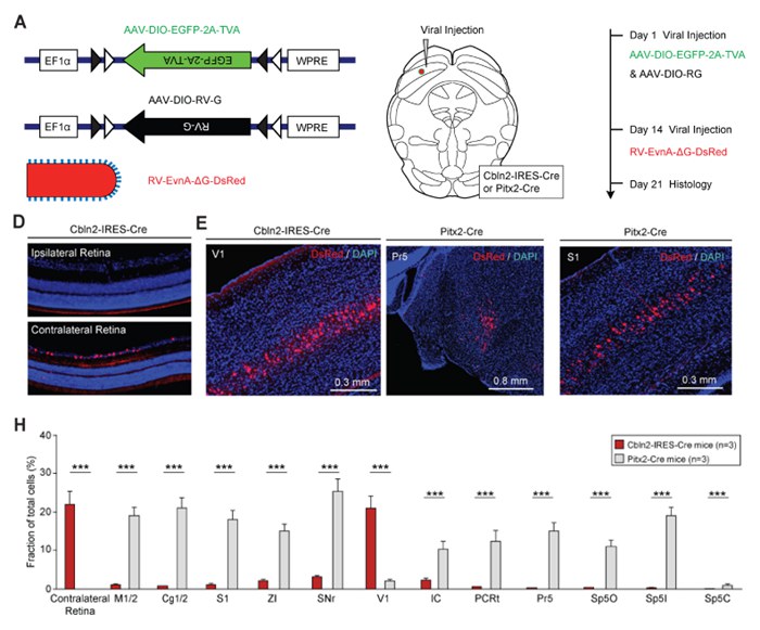 通过RV tracing的方法,研究者发现上丘Cbln2+神经元接受初级视觉皮层以及对侧视网膜的输入,而上丘Pitx2+神经元则接受初级触觉皮层以及介导头面部触觉的三叉神经复合体Pr5等的输入。