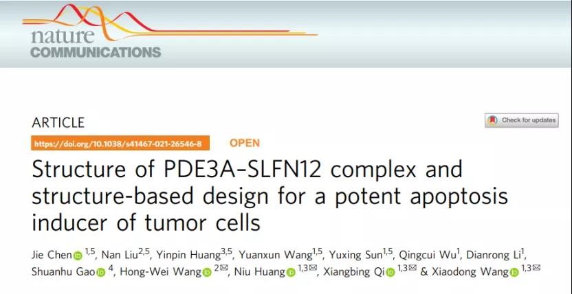 的王晓东团队联合王宏伟团队,黄牛团队和齐湘兵团队在NatureCommunications杂志上发表了题为“Structure of PDE3A–SLFN12 Complex and Structure-based Design for A Potent Apoptosis Inducer of Tumor Cells”的研究论文。该文章解析了三种结构不同的小分子化合物(anagrelide, nauclefine, DNMDP) 处理条件下的PDE3A-SLFN12复合物结构,通过对复合物结构的分析,获得小分子与蛋白复合物相互作用的关键结构信息。基于所获得的PDE3A-SLFN12复合物结构模型与结合模式,作者选用了临床上药代动力学、药效学和安全性都较好的anagrelide作为目标分子进行计算机模拟和进一步优化改造。结果表明,改造后的anagrelide类似物诱导细胞发生凋亡的活性更高,且在小鼠成瘤模型实验中,具有更强的抑制肿瘤生长的潜力。