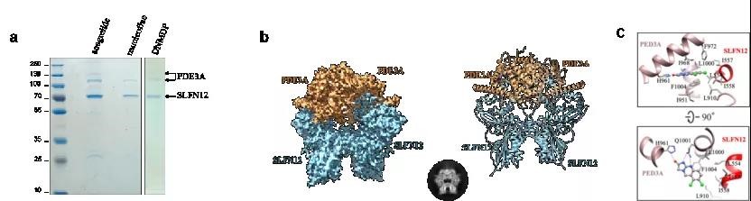王宏伟团队的刘楠博士通过冷冻电镜解析了高分辨率的小分子-PDE3A-SLFN12复合物结构。结构显示PDE3A和SLFN12形成蝴蝶状异四聚体复合物。anagrelide、DNMDP和nauclefine分子的亲水侧与PDE3A的催化口袋结合,而其疏水部分延伸至SLFN12并与之形成疏水相互作用。这些小分子像“分子胶水”一样将两种蛋白质“粘合”在一起(图1)。