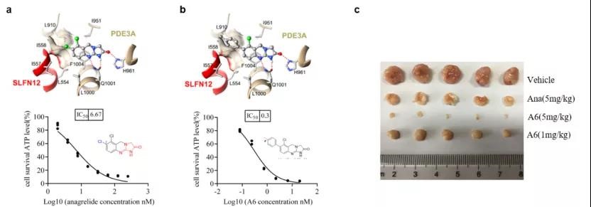 黄牛团队以anagrelide为目标,利用计算机模拟出了增强与SLFN12结合的分子;齐湘兵团队基于计算结果和结合模式设计与合成了更“粘”的分子胶水。验证发现,anagrelide类似物A6诱导细胞发生凋亡的活性可以达到pM级别。此外,在小鼠成瘤模型实验中,A6也具有更强的抑制肿瘤生长的潜力(图2)。