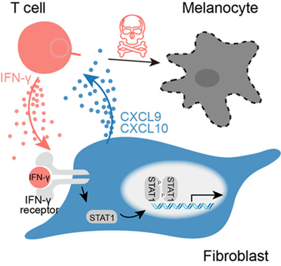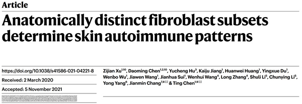 的陈婷研究团队在Nature杂志上发表了题为Anatomically distinct fibroblast subsets determine skin autoimmune patterns的研究论文,通过单细胞转录组测序、小鼠模型和一系列遗传学实验方法,揭示了皮肤成纤维细胞在白癜风疾病中的重要作用:成纤维细胞是唯一必需的能招募和激活自体活性CD8+ T细胞的皮肤细胞;不同部位成纤维细胞对IFN-γ的响应能力决定其招募CD8+ T细胞的能力,并决定白癜风的发病位置偏好。
