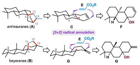 李超课题组近日在J. Am. Chem. Soc.上发表的一篇研究论文揭示,TEMPO可以有效地调控这个[3+2]自由基环化反应,使反应终止在自由基J阶段,获得目标产物K。利用该方法他们还集群式地合成了具有[3.2.1]桥环骨架结构的四环对映-贝壳杉烷型和贝叶烷型二萜(图2)。