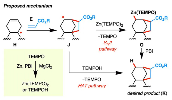 作者接着对该反应的机理进行了深入的研究。并经大量的机理实验提出了以下反应机理(图6):首先,作者证明TEMPO在该反应体系下能很快地被还原成Zn(TEMPO)2。接着他们通过对反应的监测、氘代实验以及将Zn(TEMPO)2制备出来代替TEMPO等实验证明二级自由基J与Zn(TEMPO)2发生SH2反应生成锌试剂O,然后中间体O从PBI或者后处理过程中获得一个质子生成产物K。由于位阻作用,三级自由基中间体H不会和大位阻的Zn(TEMPO)2反应。当然还有另一种机理上的可能性不能排除,即Zn(TEMPO)2首先在PBI中获得一个质子生成TEMPOH,二级自由基J从TEMPOH中获得一个氢原子得到目标产物K(HAT反应)。