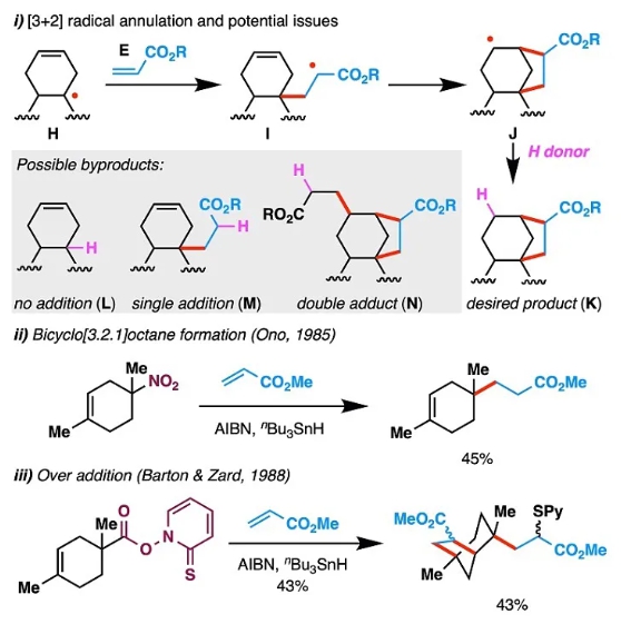 自由基串联环化反应是构建复杂分子环系的有效方法,分子内的自由基多烯环化反应已被成功地应用于许多复杂天然产物的全合成工作中。然而,分子间的自由基环化反应则具有一定的挑战性,除了控制环化反应的立体选择性和区域选择性之外,还必须有效地控制自由基反应的有序进行。[3.2.1]桥环体系普遍存在于天然产物中,尤其在四环二萜中最为常见。[3+2]自由基环化反应是构建[3.2.1]桥环体系的有效方式(如图1i),但在反应体系中会同时存在三种不同的自由基中间体H、I、J。如何利用有效的氢源将自由基终止在J阶段是个尚未解决的科学问题。