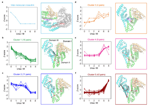 接着,作者以具有多个结构域的牛血清白蛋白(BSA)为研究对象,逐渐增加尿素浓度,用DOPA2交联质谱技术解析了BSA的变性过程:低浓度(1-2M)尿素破坏BSA单体之间的相互作用,体现在单体-单体之间的交联迅速降低;单体内不同结构域之间的相互作用也开始受到影响,其程度随尿素浓度升高而加剧,直至在6M 尿素条件下完全消失;结构域内部的相互作用最为稳定且表现出协同性,相应的交联在0-4M和6-8M尿素浓度区段都没有明显改变,只在4-6M区段大幅度降低。