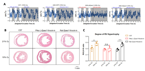 为了探究上述结论是否适用于在体情况,研究人员使用CRISPR/Cas9构建了敲入高原鼠兔L-Epas1基因的C57小鼠。将敲入高原鼠兔L-Epas1基因的小鼠的视交叉上核(Suprachiasmatic nucleus,SCN,哺乳动物生物钟中枢)进行体外培养,发现敲入高原鼠兔L-Epas1基因使SCN的生物节律对缺氧胁迫更加敏感。通过注射AAV病毒使小鼠在SCN特异性表达高原鼠兔L-Epas1可以使小鼠在低氧环境下体温节律的稳定性下降(图4A),进一步证明了Epas1稳定性增加会导致生物节律的紊乱。