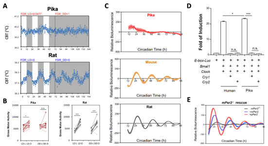 哺乳动物昼夜节律生物钟的核心振荡器是由转录激活因子Clock/Bmal1和转录抑制因子Per/Cry构成的转录翻译反馈回路(Transcription-translation feedback loop,TTFL)。研究人员通过荧光素酶报告基因实验发现高原鼠兔的Clock、Bmal1、Cry1/Cry2具有正常的转录激活/抑制功能,且向小鼠Per2-/-成纤维细胞回补高原鼠兔的Per2可以重建稳定的生物节律(图2D–E),说明高原鼠兔核心生物钟基因的自身功能并无异常。