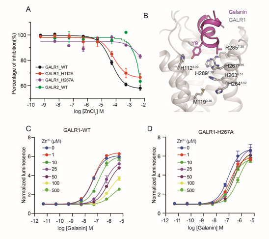 以前的研究发现Zn2+可以抑制甘丙肽与其受体的结合。Zn2+作为一种重要的神经递质,广泛存在于神经系统中,但是其具体的生理功能仍然不清楚。随后研究者进一步证实Zn2+可以特异性地抑制甘丙肽对GALR1的激活而对GALR2的影响非常小(图4A) 。通过细致的结构分析,发现在GALR1配体结合位置的下方含有大量的组氨酸 (图4B) ,组氨酸常常参与金属离子的配位结合。进一步的功能实验确定了H2676.55位点是Zn2+发挥调节作用所必需的 (图4C和4D) 。这个位点在不同物种的GALR1基因中高度保守,但在同家族的GALR2中被替换为疏水的异亮氨酸,表明Zn2+对GALR1特异的调节作用。