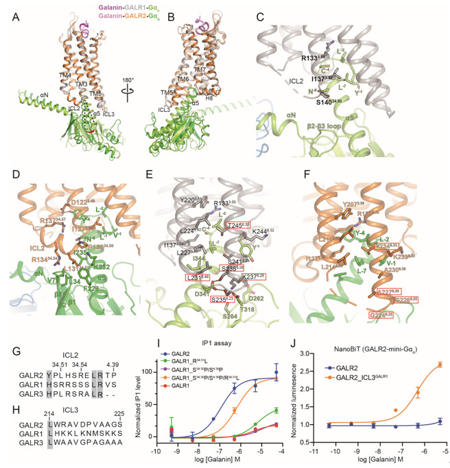研究人员通过比较GALR1-Go和GALR2-Gq的复合物结构,观察到GALR受体与不同G蛋白结合的界面不完全相同(图3A和3B) 。GALR2主要通过其胞内ICL2 (Second intracellular loop) 区段结合Gαq蛋白 (图3C和3D) ,而GALR1通过ICL3区段结合Gαo蛋白。GALR2的ICL2上负责结合Gq的关键位点在GALR1中的对应位置也产生了替换(图3G),而GALR1的ICL3上与Gαo结合的关键位点在GALR2中发生了改变(图3H) 。研究人员进一步证实了将GALR1的ICL2上三个关键氨基酸,S14034.50、R14134.51和S1494.49分别突变为GALR2对应的残基之后,GALR1获得了偶联Gq的能力(图3I) ,而GALR2的ICL3被GALR1相对应的序列替换后与Go的结合能力明显增强 (图3J) 。