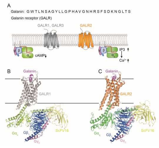 甘丙肽(Galanin)是一种神经肽,广泛分布于神经系统中,参与调控多项生理活动,如能量代谢、疼痛、癫痫以及睡眠。它可以激活三种不同的GPCR:GALR1、GALR2以及GALR3。虽然这三个GALRs能够识别相同的配体,但是激活不同的G蛋白亚型。GALR1和GALR3主要激活Gi/o信号通路,导致cAMP水平的下降,而GALR2激活Gq/11,导致细胞质中IP3和钙离子的水平升高(图1A) 。为了了解GALR识别配体和G蛋白的分子机制,研究人员通过冷冻电镜方法解析了结合甘丙肽的GALR1‒Go和GALR2‒Gq的复合物结构 (图1B和1C) 。