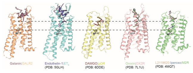 通过对GALR家族结构的分析,研究人员观察到了不寻常的受体-配体结合模式和信号转导特点。首先,作为一个天然配体,甘丙肽以近乎平行于细胞膜的结合方式“躺”在GALR的顶部,不同于大多数肽类配体垂直插入受体口袋的模式,也不同于大多数小分子配体深入受体内部的特点(图2) 。这样的结合更接近某些受体的正向别构调节分子所采用的方式。
