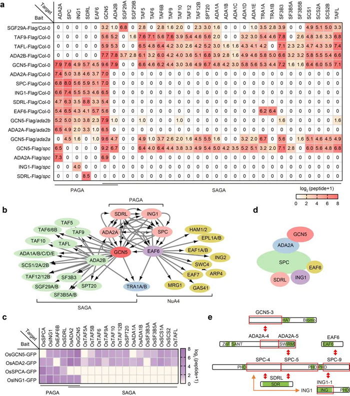 该研究通过亲和纯化联合质谱分析,在拟南芥和水稻中鉴定到植物特异的包含GCN5的蛋白复合体。拟南芥PAGA复合体由GCN5和ADA2A两个保守亚基以及SPC、ING1、EAF6和SDRL四个植物特异亚基组成;其中GCN5是PAGA和SAGA复合体的共有亚基,EAF6是PAGA和NuA4类型组蛋白乙酰化酶复合体的共有亚基(图1)。通过酵母双杂交和pull-down实验发现, SPC在PAGA复合体中起到支架蛋白的作用,组蛋白乙酰化酶GCN5通过桥梁蛋白ADA2A被招募到SPC上,其余亚基直接结合在SPC上(图1)。生化实验结果显示,SPC不仅能够增强ING1结合甲基化H3K4多肽的能力,还能够增强GCN5-ADA2A乙酰化组蛋白H3的能力,揭示了PAGA复合体介导组蛋白乙酰化修饰的分子机制。