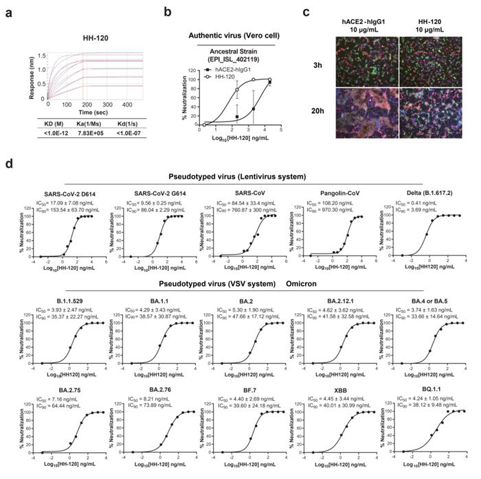 b, hACE2-hIgG1和HH-120对真病毒中和活性分析;