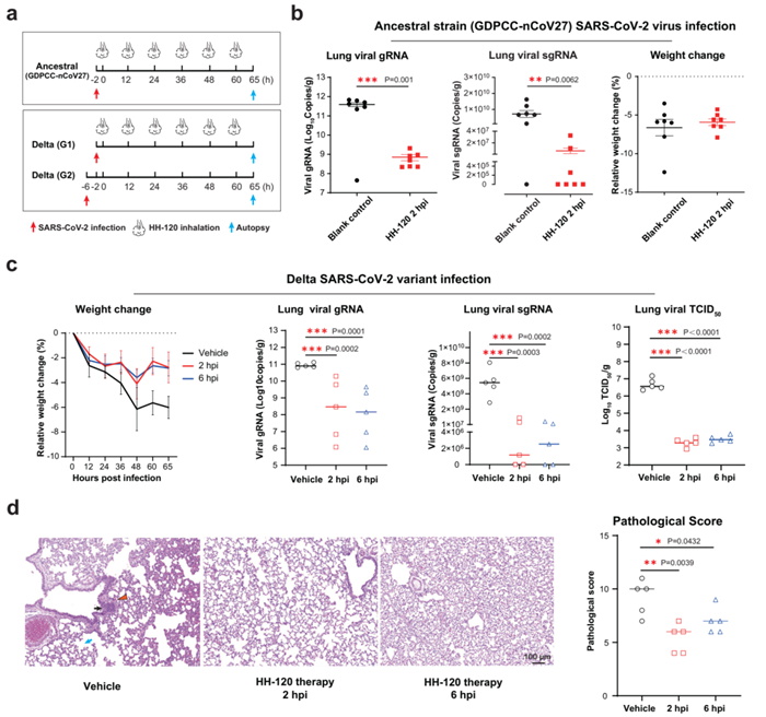 HH-120雾化剂在初始毒株(GDPCC-nCoV27)和Delta变异株SARS-CoV-2病毒感染的金黄色叙利亚仓鼠模型的治疗效果评估。