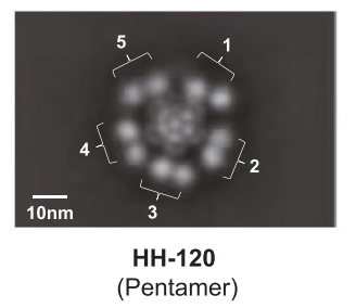 2003年,李文辉和包括隋建华在内的其他同事是SARS-CoV病毒受体ACE2全球最早的发现者[1]。在2020年初新冠疫情出现后,ACE2分子也被确定是新冠病毒SARS-CoV-2感染的关键受体,基于ACE2在新冠病毒侵入感染过程中的关键作用,对ACE2分子进行改造和药物开发在抗新冠病毒感染方面具有重要意义。李文辉实验室和隋建华实验室与合作伙伴华辉安健团队共同努力,成功获得了以人ACE2金属蛋白酶区域为基础单元,经过了全方位和多层次优化设计的HH-120分子。在电镜下观察,其分子直径约40 nM,呈现为舒展的花朵形状(图1)。