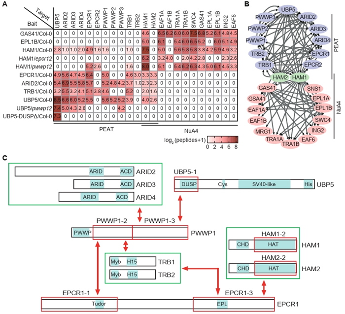 组蛋白H2A的泛素化修饰在植物染色质状态和基因表达调控过程中具有重要作用。以往的研究发现,真核生物中保守的PRC1蛋白复合体负责植物组蛋白H2A的泛素化修饰,然而对植物中的H2A去泛素化的分子机制知之甚少。何新建实验室以往的研究发现了一个植物特异的多亚基蛋白复合体PEAT。在该研究的基础上,何新建实验室当前的研究发现,拟南芥中的PEAT复合体不仅包括以往鉴定到的四类组分,还包含两类具有酶催化活性的新组分,即两个功能冗余的组蛋白乙酰化酶HAM1和HAM2(HAM1/2)以及一个未知功能的泛素特异蛋白酶UBP5(图1)。