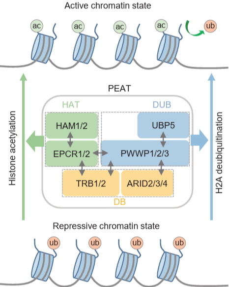 总之,该研究发现了拟南芥中的关键组蛋白H2A去泛素酶UBP5,并证明UBP5其作为PEAT复合物的亚基发挥作用。PEAT复合物中的UBP5-PWWP模块和HAM1/2-EPCR模块分别负责组蛋白H2A去泛素化和H4K5乙酰化,揭示了PEAT复合物通过双重作用调控染色质状态及基因表达的分子机制(图3)。
