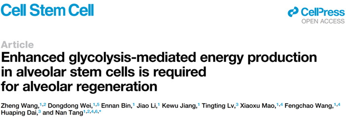 汤楠实验室在Cell Stem Cell杂志在线发表了题为“Enhanced glycolysis-mediated energy production in alveolar stem cells is required for alveolar regeneration”的研究论文。该研究揭示了调控肺泡干细胞分化的机制,并解析了衰老如何导致肺泡再生障碍。