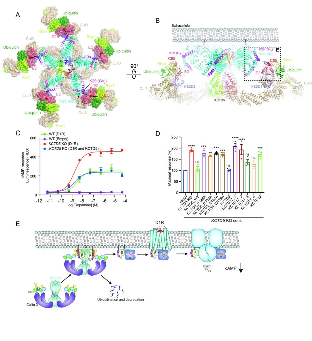 此外研究者解析KCTD7与Cullin 3的复合物结构,解释为什么有些KCTD蛋白不能结合Cullin-3(图1C和1D)。以研究中获得的KCTD5/Gβγ和KCTD7/Cullin-3结构为参考,研究者最终搭建了包含E2-Ubiquitin、Cullin-3/Rbx1、KCTD5和Gβγ的酶-底物复合物模型(图2A和2B),揭示了五聚化的KCTD5/Cullin-3如何将E2偶联的Ub快速转移到五个Gβγ亚基的泛素化位点上。此外研究者发现KCTD5通过泛素化降解Gβγ调控D1多巴胺受体下游cAMP的产生(图2C,2D和2E)。