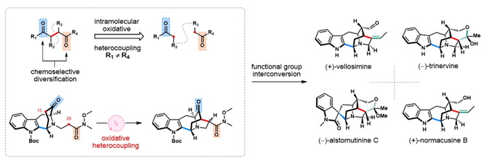 Sarpagine天然产物是一类提取自具有药用价值的夹竹桃科(Apocynaceae)萝芙木属(Rauwolfia)植物的单帖吲哚生物碱,具有抗癌、抗炎、镇痛等丰富的生物活性。该家族成员具有共同的氮杂[2.2.2]辛烷笼状核心骨架。因其多样的生物活性和结构复杂性,Sarpagine生物碱一直是近几十年来合成化学界的研究热点,吸引了包括Masamune,Tamelen,Kutney,Magnus,Cook,Martin,Takayama,Gaich,Kerr,刘铸晋,祝介平,厍学功,张敏,张洪彬,秦勇,高章华/雷克微等十几个课题组的研究兴趣。齐湘兵实验室一直致力于天然产物的高效仿生合成,在分析sarpagine家族生物碱的结构特点基础上针对核心氮杂[2.2.2]辛烷骨架设计了分子内双羰基交叉氧化偶联反应策略。羰基化合物α位碳之间的氧化偶联反应作为构建Csp3-Csp3键的重要方法因具备无需预官能团化,原子经济,以及产物1,4-二羰基化合物可以多样化官能团转化等优势,在天然产物全合成中有广阔的应用潜力。然而分子内两个不同羰基化合物间的氧化偶联因为羰基邻位氧化电势的差异而存在较多的竞争反应,例如同源二聚(Homocoupling)、Aldol反应、Claisen缩合等等,从而导致反应活性和选择性控制面临巨大挑战。齐湘兵实验室开发了由碘单质(I2)介导的双羰基分子内交叉氧化偶联反应,实现了氮杂[2.2.2]辛烷笼状骨架的高效构建,并成功应用于sarpagine家族成员(−)-trinervine,(+)-vellosimine,(+)-normacusine B以及(−)-alstomutinine C的发散式全合成。