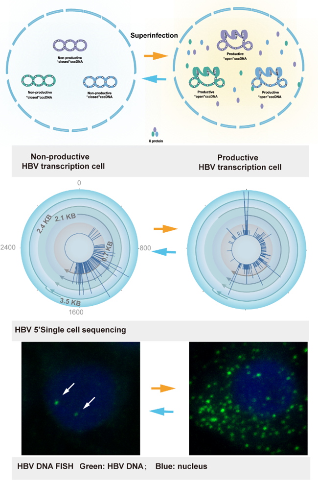 本研究作者通过灌注分离已建立HBV持续性感染的人源化肝脏FRG小鼠的肝脏单细胞,运用5’单细胞转录组测序结合HBV DNA FISH影像研究和病毒学分析,发现:在一个细胞内,不同cccDNA要么全部都活跃转录,产生HBV各个转录本;要么都处于非活跃转录状态,不转录病毒结构基因和产生子代病毒,而仅在HBx/Enhancer I区域产生转录本;非活跃转录的cccDNA能够有效地被新的一轮病毒感染(超感染)所激活。病毒HBx蛋白在协调同一细胞内cccDNA转录模式和超感染激活中起重要作用。阻断HBV在肝内持续传播和超感染,提高处于病毒非活跃转录状态肝细胞的比例,可能有重要治疗意义。