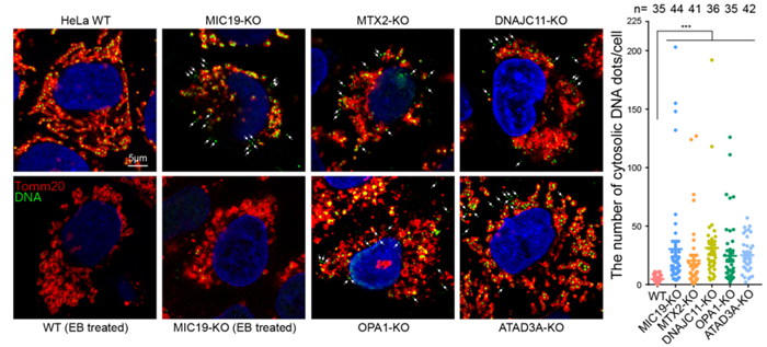 左图为野生型和嵴损伤HeLa细胞的染色。红色标记线粒体,绿色标记线粒体DNA,蓝色为DAPI标记的细胞核,白色箭头标记游离在细胞质中的线粒体DNA。EB处理去除了线粒体内和胞质中的线粒体DNA。右图为细胞质中线粒体DNA点数量统计。