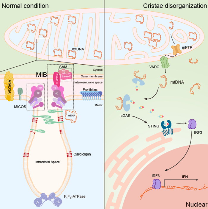图2:线粒体嵴损伤导致mtDNA释放和I型干扰素反应的模式图