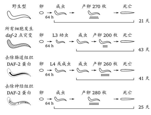 2) 发现特异性去除肠道细胞中的胰岛素受体蛋白不仅使线虫寿命延长94%,接近于经典的daf-2(e1370)突变体的长寿程度(延长106%),而且很大程度上避免了daf-2(e1370)线虫所遭遇的发育受阻、产卵量减少这两大副作用。这表明长寿并非一定要以生殖和发育为代价。