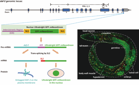 另外,本文回答了一个衰老领域29年悬而未决的问题。1993年CynthiaKenyon 发现daf-2基因突变使线虫寿命翻倍,由此打开了衰老分子调控机理研究的序幕。但是,daf-2基因在哪些细胞中表达却一直不清楚。daf-2基因表达量低、转录起点多、内含子多、剪接异构体多、编码区长(50 kb),这些都不利于表达定位。本文利用daf-2所有mRNA异构体都共享3’序列这一特点,通过基因原位编辑在3’端引入SL2反式剪接序列和携带双重核定位信号的串联绿色荧光蛋白报告基因(称为Nuclear ultrabrightGFP::mNeonGreen,简称NuGFP)。NuGFP元件随被标记基因共转录,反式剪切后产生彼此独立的被标记基因mRNA与NuGFPmRNA,各自被翻译成蛋白,互不影响。借助于聚集到细胞核中的高强度NuGFP荧光信号,作者发现daf-2在线虫全身广泛表达(图2)。这个方法具有通用性,可服务于其它线虫基因的内源表达定位研究。